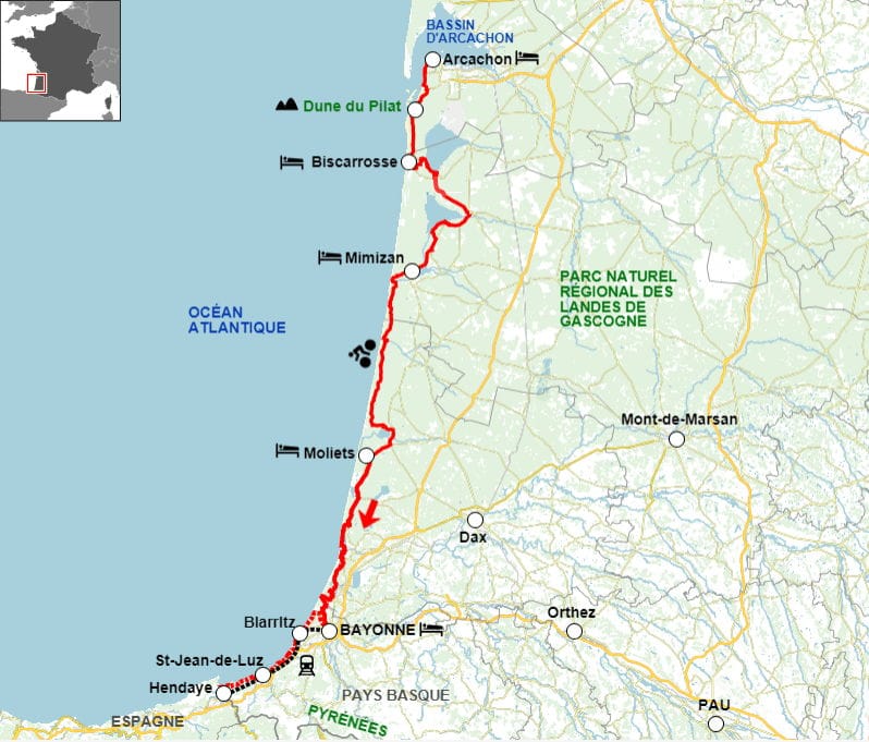 Cet itinéraire parfaitement plat traverse la plus grande forêt de pins d'Europe et longe plus de 100 km de plages ininterrompues. Le parcours offre des haltes baignade régulières : plages toniques de l'Atlantique ou étangs paisibles de Cazaux, Biscarrosse, Parentis et Léon.