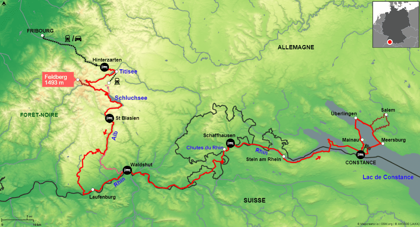 Cet itinéraire à vélo d'une exceptionnelle variété vous emmènera de la sauvage Forêt-Noire au majestueux lac de Constance, en passant par la vallée du Rhin et ses chutes dantesques ! Il constitue également un beau parcours d'approche vers les Alpes, que vous apercevrez déjà au loin dès la deuxième journée si le ciel est limpide, avant de vous retrouver presque au pied de celles-ci au lac de Constance, surnommé d'ailleurs la riviera des Alpes ! Entre petites routes très tranquilles et voies cyclables, le parcours se prête à merveille à la pratique du vélo qui plus est.
