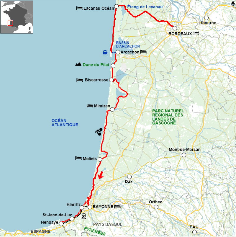 - Si, à l’inverse, vous souhaitez un itinéraire plus court, il est également possible de commencer cet itinéraire à Arcachon plutôt qu’à Bordeaux. Cela le raccourcit de 2 jours.